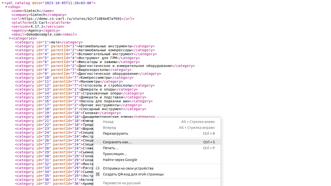 Теперь прайс-лист (YML-файл) можно сгенерировать и открыть.