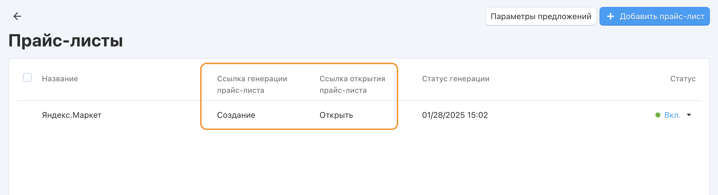 Откройте страницу прайс-листов через Настройки → Экспорт в Яндекс.Маркет.