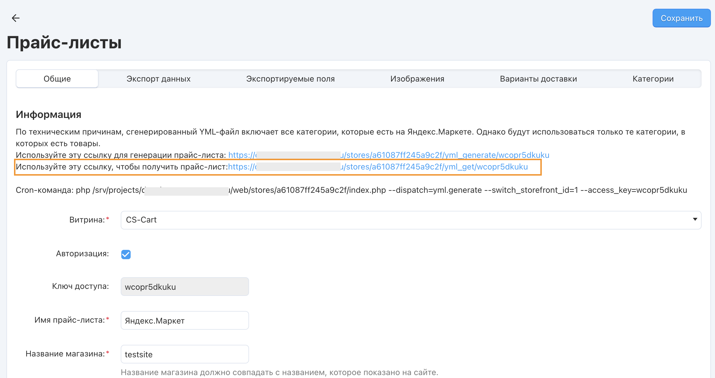 Ключ доступа | Ключ для доступа к прайс-листу при включенной настройке авторизации |
