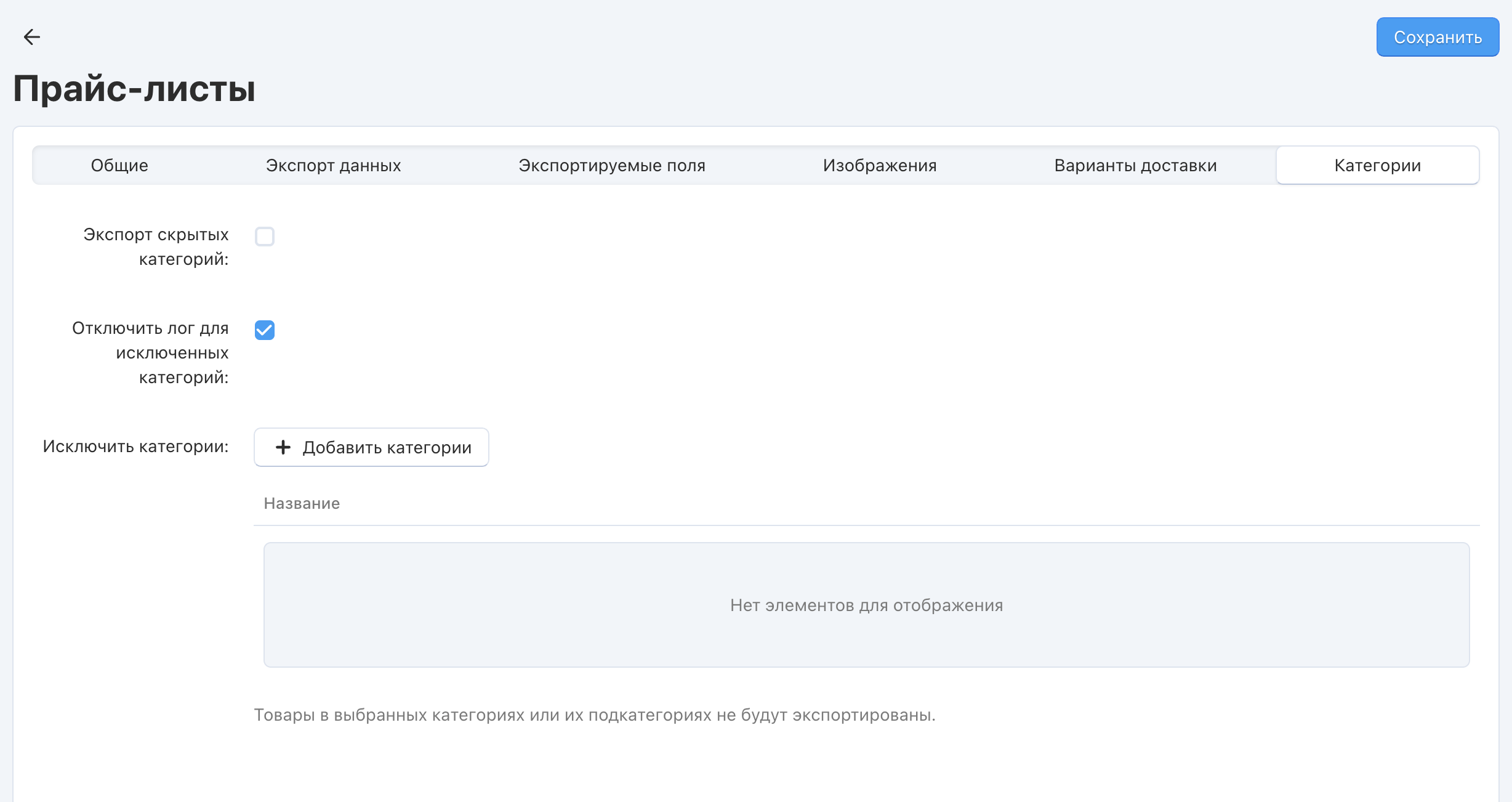 Экспорт скрытых категорий | Если включить настройку, то товары будут экспортироваться, даже если они находятся в скрытых категориях. |