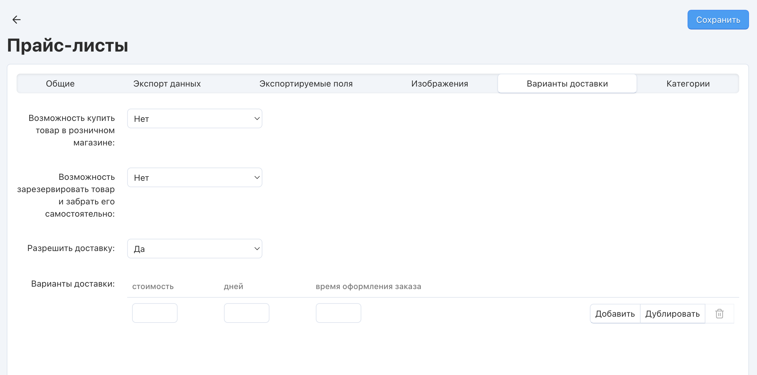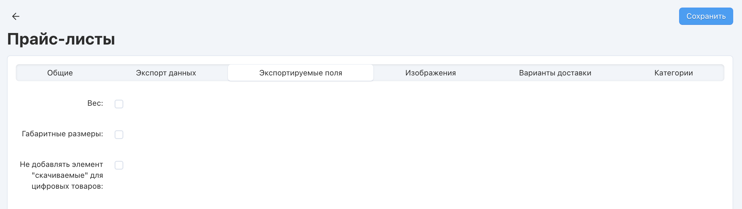 - Создайте новый прайс лист или откройте редактирование существующего на странице Модули → Экспорт в Яндекс.Маркет.