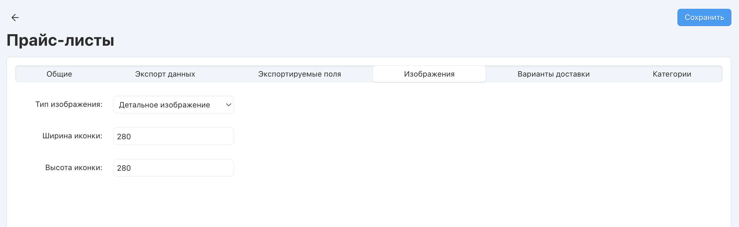 Тип изображения | В прайс-лист могут быть выгружены полные изображения или уменьшенные копии (иконки). Иконки будут созданы автоматически. |
