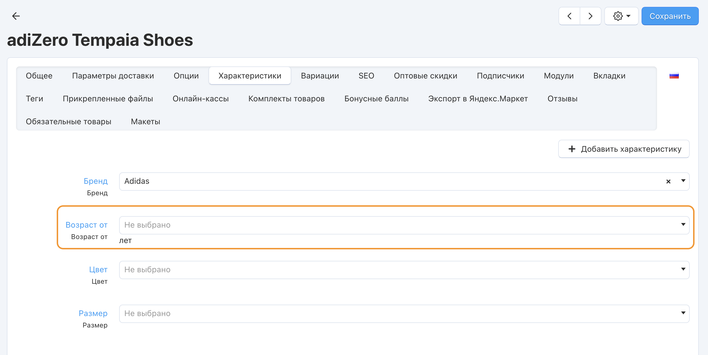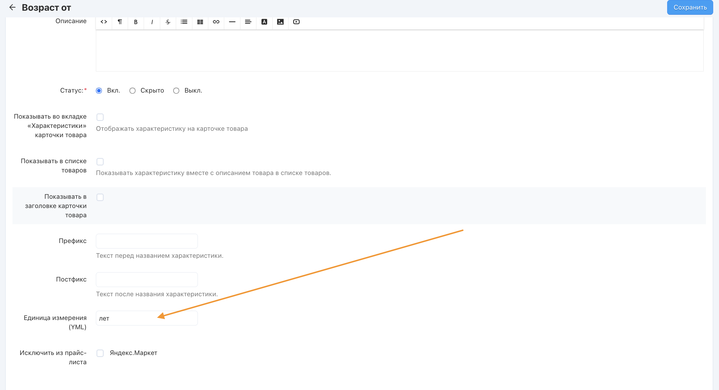При экспорте в YML-файле для характеристик, у которых указаны единицы измерения, добавляется атрибут unit.