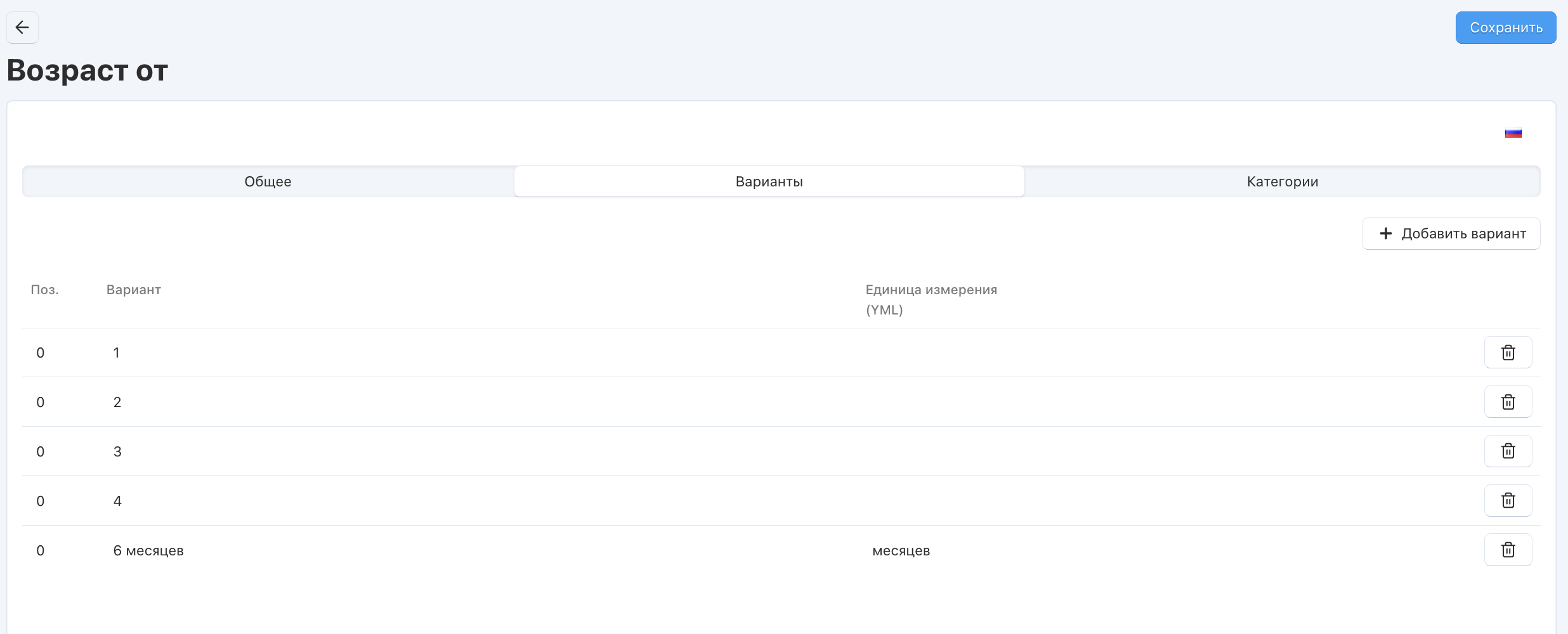 При необходимости, есть возможность указать единицу измерения для конкретного варианта.