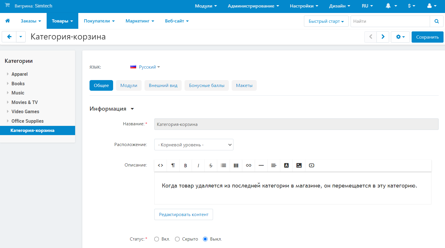 У каждой витрины есть своя категория-корзина, которую нельзя переименовать; эта категория создаётся автоматически, когда администратор удаляет какую-нибудь категорию. Категория-корзина находится в конце списка товаров и выключена по умолчанию, чтобы товары из неё не попадали на витрину.