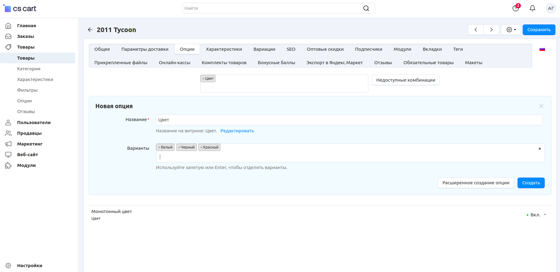 Нажмите на название товара, чтобы открыть его настройки, и перейдите на вкладку Опции.