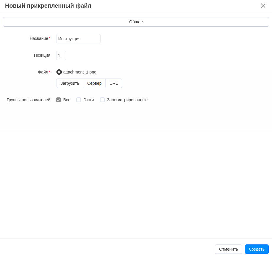 Вкладка Прикрепленные файлы появится, только если на странице Модули → Скачанные модули включен модуль Прикрепленные файлы.
