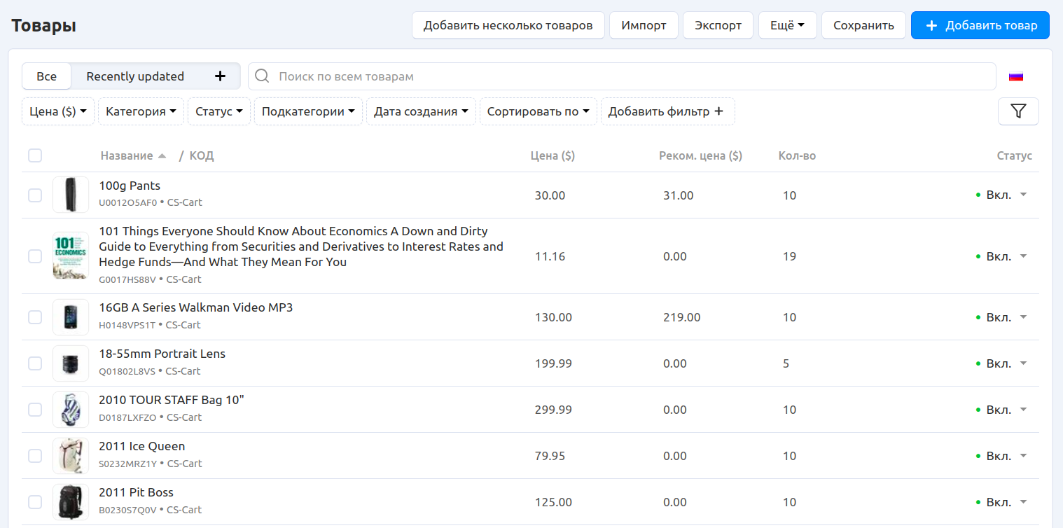 Цену, рекомендованную цену, количество и статус можно поменять прямо на списке товаров. Если вы меняете что-то кроме статуса, нажмите кнопку Сохранить перед тем, как уйдёте со страницы.