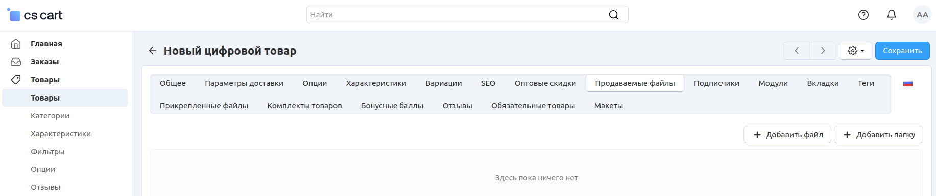 Следующие настройки появляются, если на странице Настройки → Общие → Каталог поставлена галочка Включить продажу цифровых товаров: