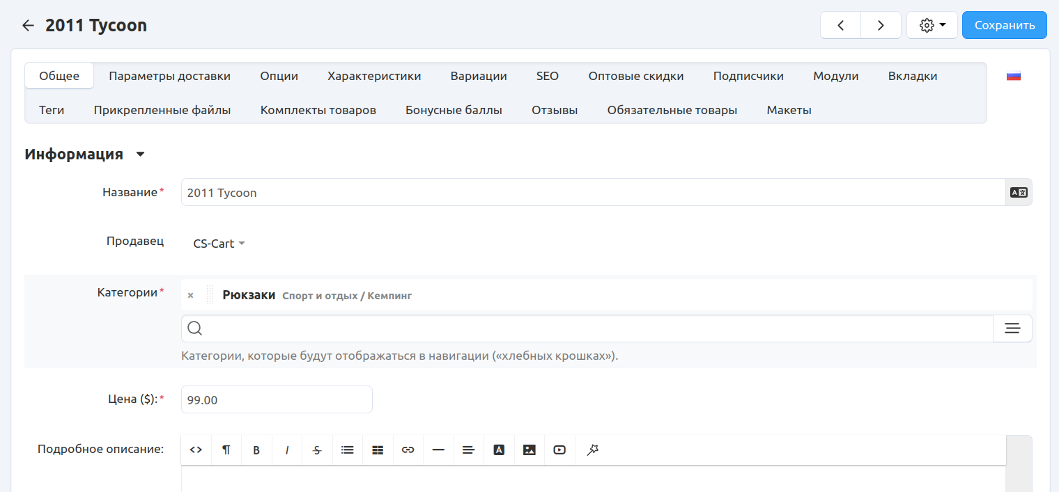 При создании или редактировании товара можно указать много разных свойств. Для удобства они распределены по вкладкам на странице редактирования товара.