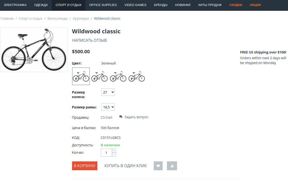 В CS-Cart такие свойства задают с помощью характеристик. Похожие товары, объединенные по одной или нескольким характеристикам называются вариациями. У каждой вариации товара будет свой артикул, цена, изображение, параметры доставки и пр.