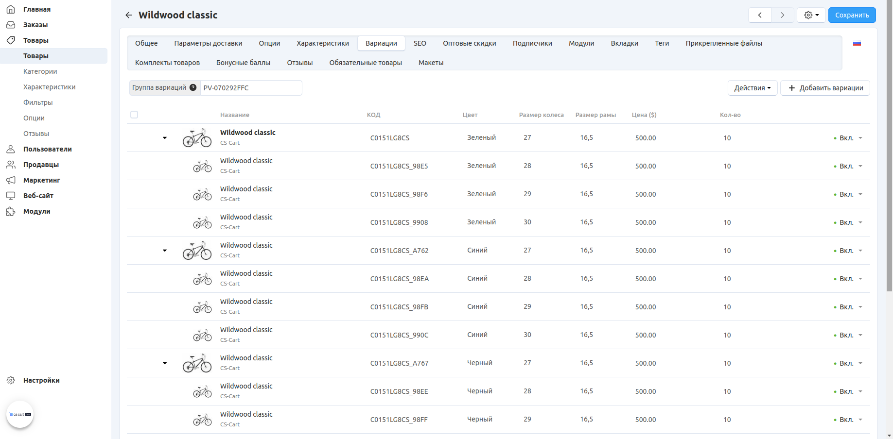 Когда эталонный товар и его характеристики созданы, то остальные сочетания характеристик (вариации) можно создать автоматически. Создадим вариации для велосипеда:
