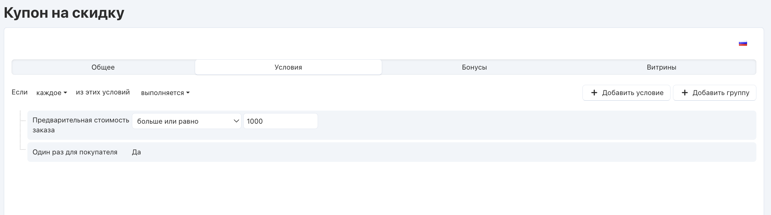 Рядом с условием вы увидите надпись Здесь пока ничего нет. Это означает, что пока коды для купона не создавались. Эти коды будут создаваться промо-акцией, которую мы настроим в шаге 2.