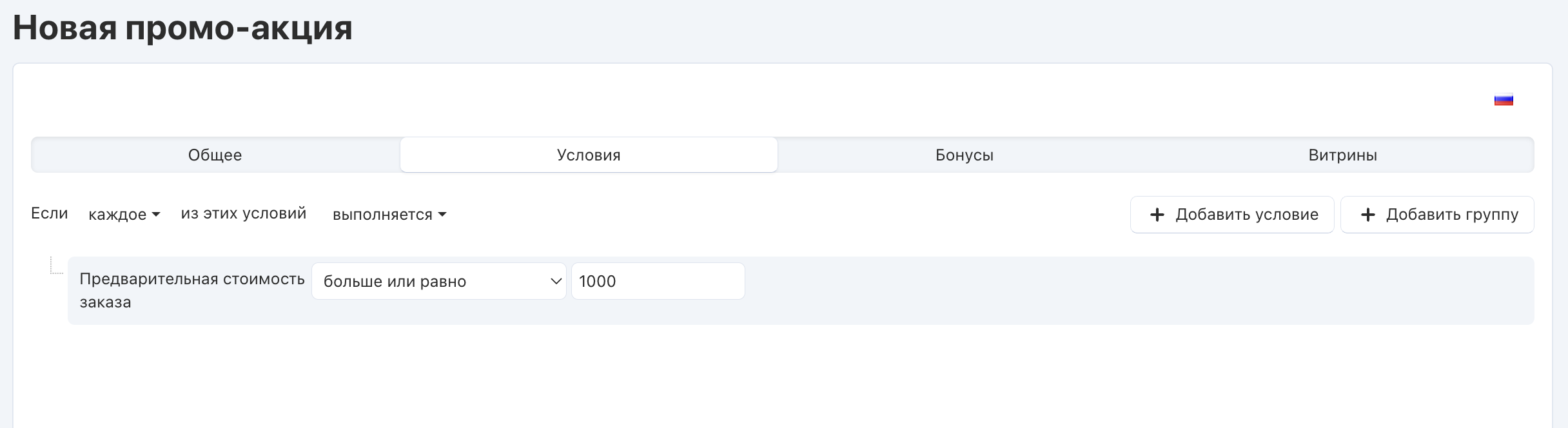5. Выберите в выпадающем списке условие Предварительная стоимость заказа с вариантом больше или равно и введите желаемую сумму.