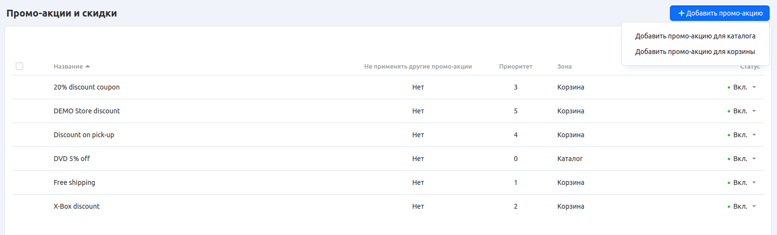 • Статус — статус промо-акции (Вкл., Выкл., Скрыто).