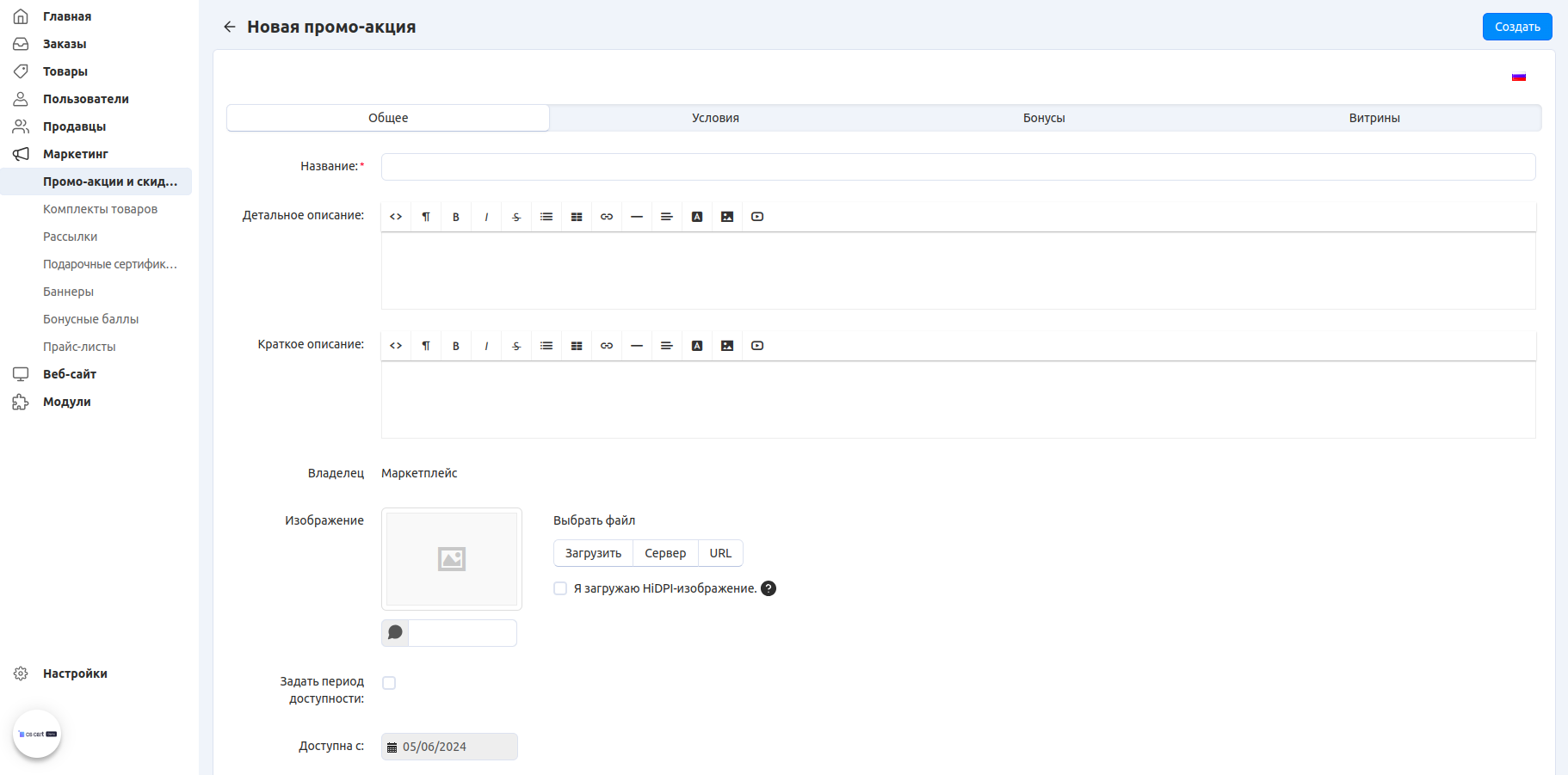 3. Откроется форма создания промо-акции. Введите необходимую информацию на вкладке Общее: