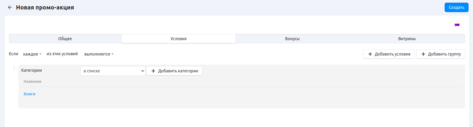4. Перейдите на вкладку Условия. Она определяет, в каких случаях применяется промо-акция.