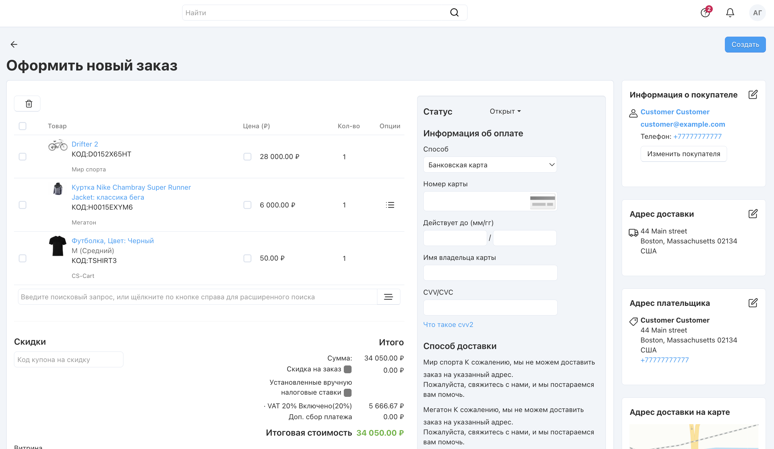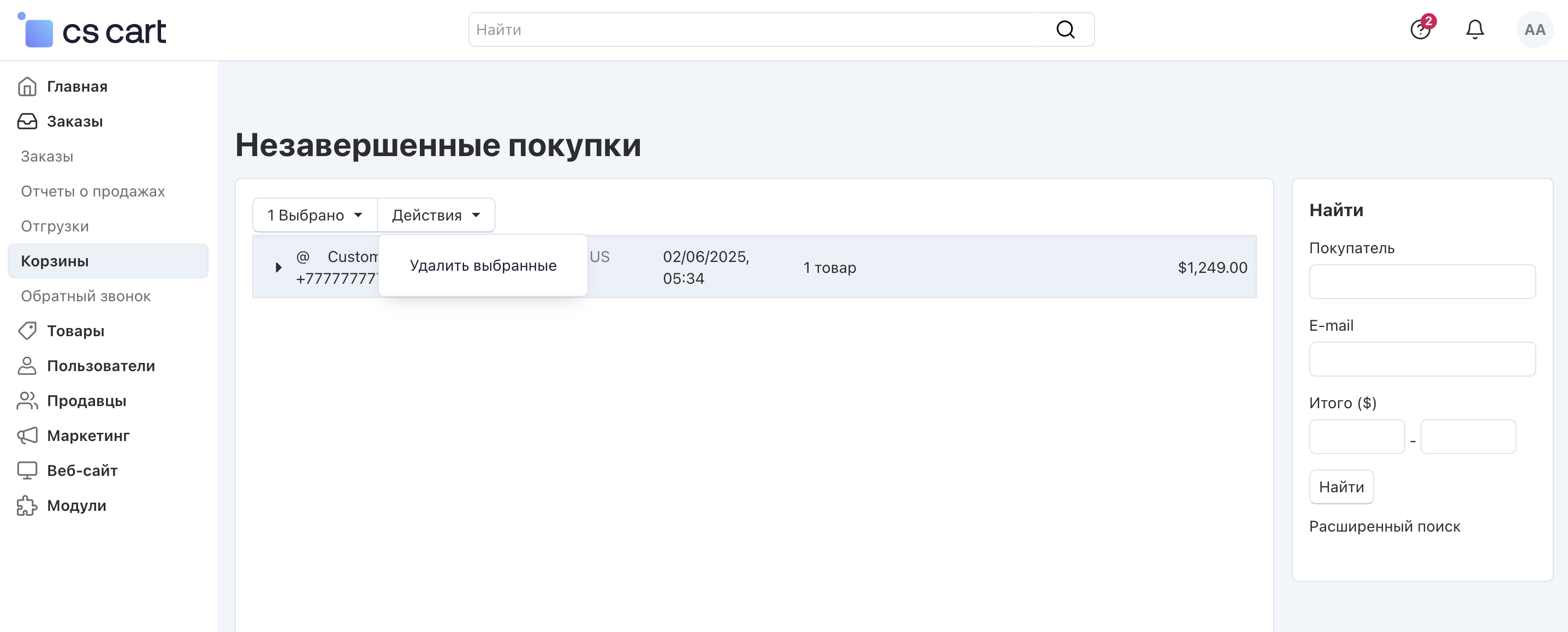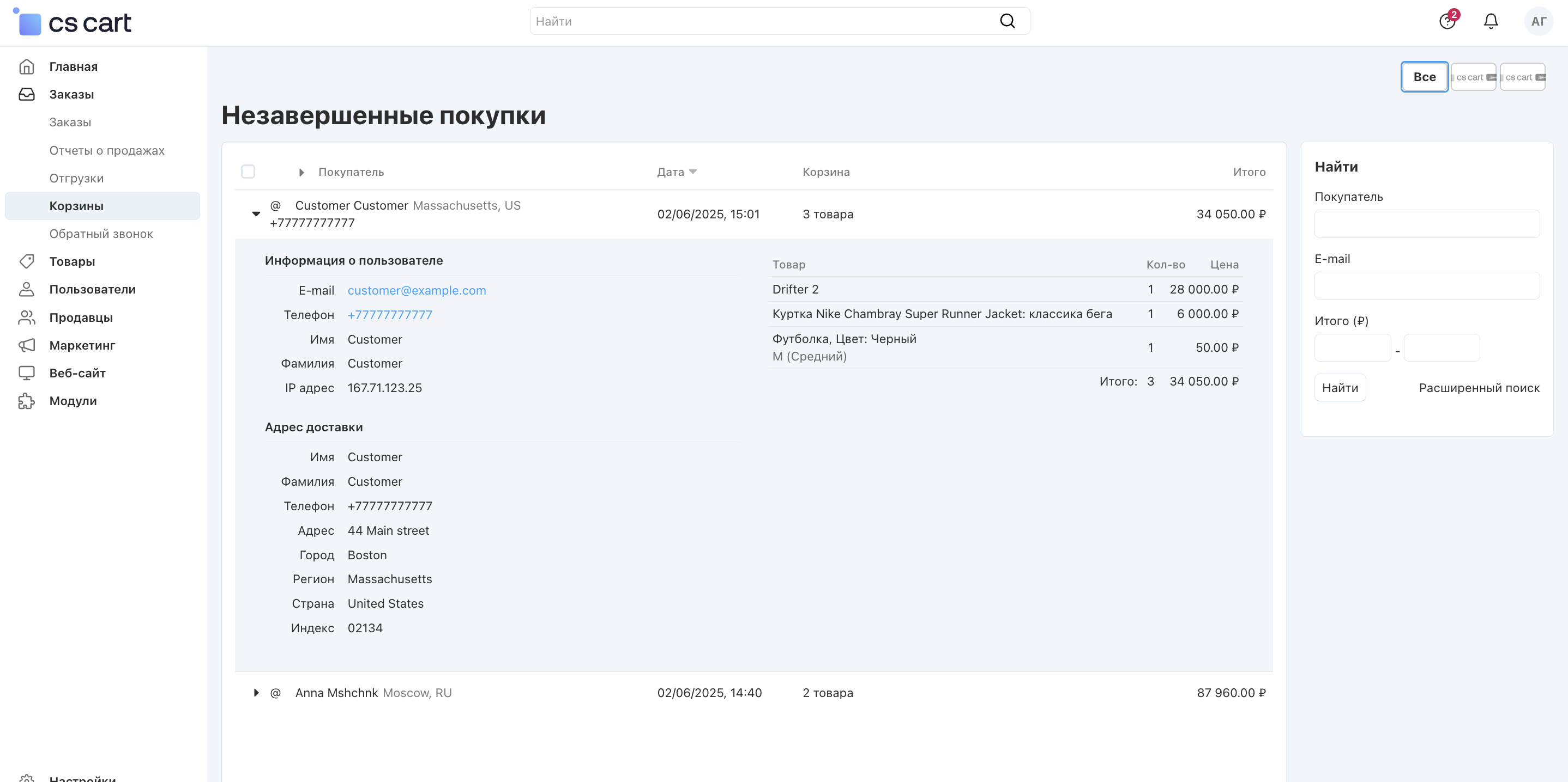 С помощью кнопки Сделать заказом рядом с оставленной покупательской корзиной вы можете помочь покупателю оформить заказ на товары в корзине. После нажатия Сделать заказом вы переместитесь на страницу создания заказа в панели администратора и сможете отредактировать информацию и создать новый заказ.