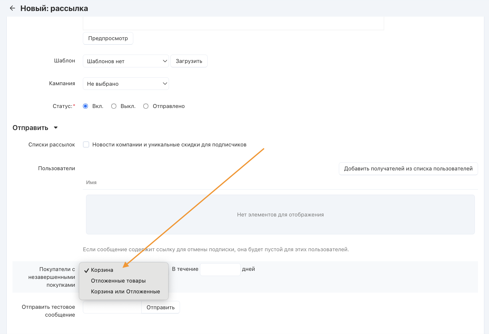 На странице Заказы → Корзины находится информация о том, какие товары находятся в корзине или в списке отложенных товаров у конкретных пользователей, но которые ещё не куплены. Когда зарегистрированный пользователь уходит с сайта магазина, а затем возвращается, то товары, которые были в корзине, но не были куплены, снова возвращаются в корзину.