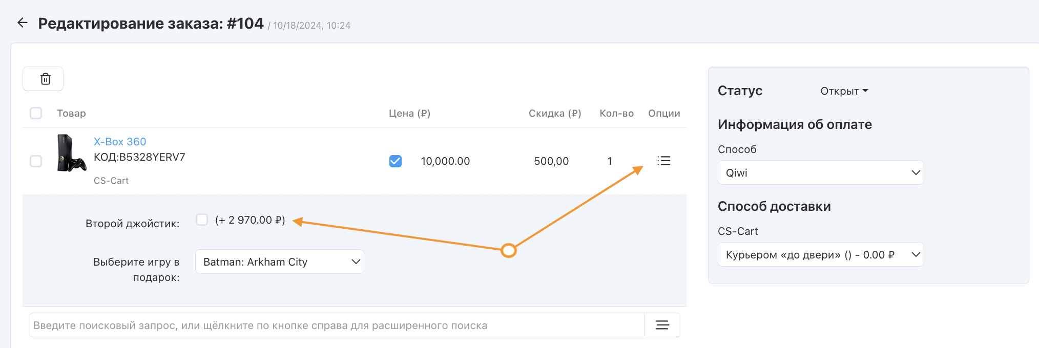 Изменить опции товара в заказе: если у товара есть опции, в столбце Опции напротив товара будет иконка с изображением списка. Нажмите на иконку, чтобы выбрать опции товара. Если у опции есть модификатор цены, уберите галочку Цена у товара и нажмите на кнопку Пересчитать суммы, чтобы цена товара обновилась с учётом выбранного варианта опции.