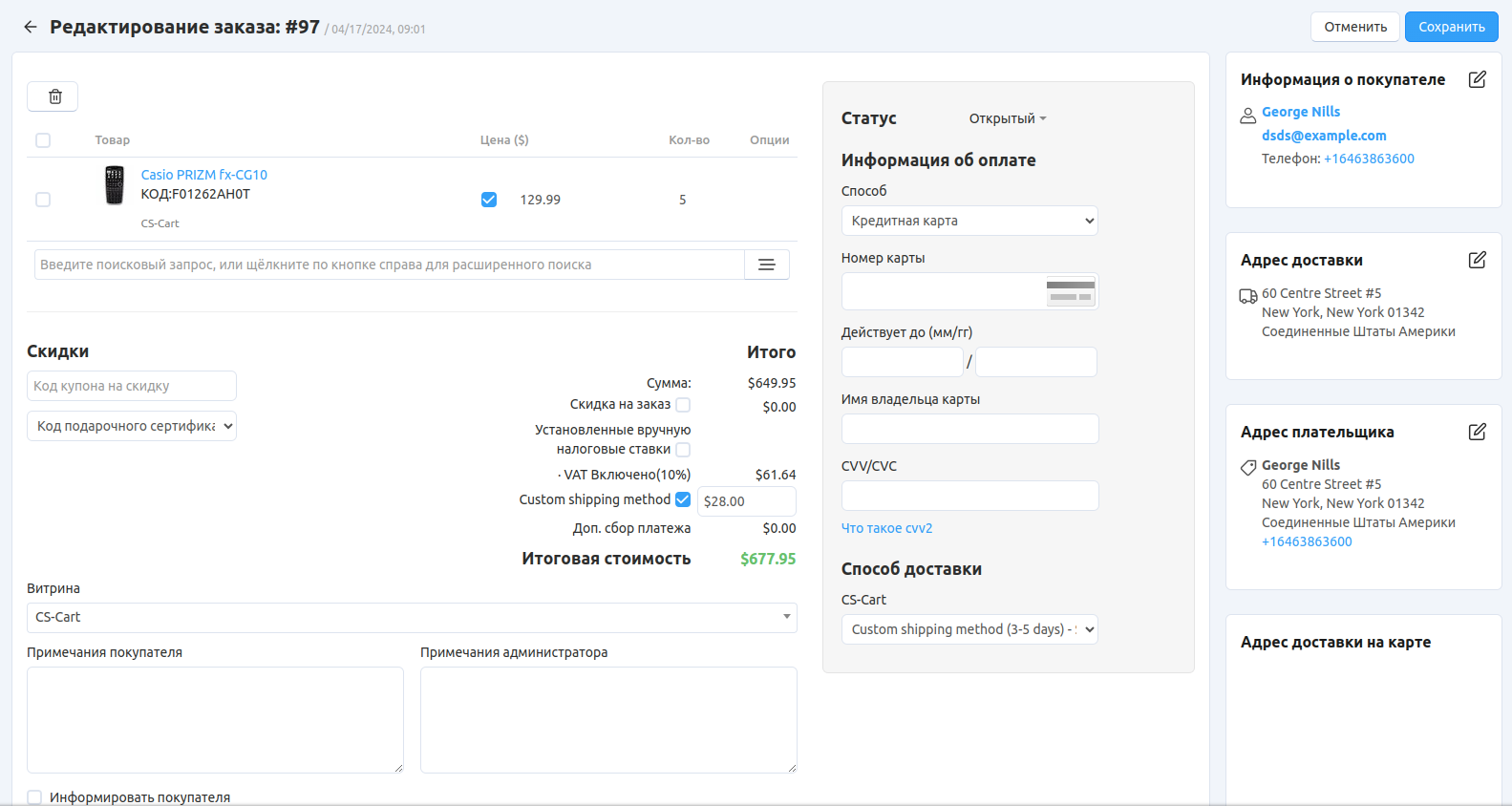 - Выбрать статус заказа/способ оплаты/способ доставки: используйте выпадающие списки на панели справа.