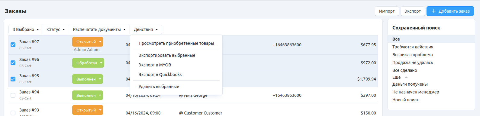 На странице Заказы → Заказы можно выполнить много массовых действий над заказами, например, массово распечатать счета или экспортировать заказы.
