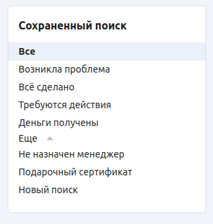 Если вы регулярно ищете заказы по каким-то критериям (например, все новые заказы, которые были оплачены с помощью подарочного сертификата), то вы можете сохранить набор поисковых критериев. Тогда этот набор появится на странице Все заказы справа, в списке Сохранённый поиск.