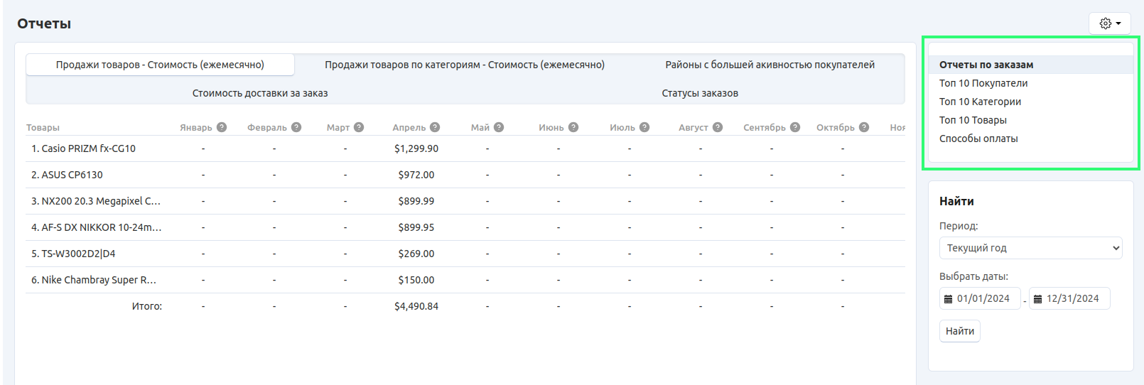 На странице Заказы → Отчеты о продажах находится статистика продаж, сделанных в вашем интернет-магазине. Статистика может быть представлена в виде таблиц или диаграмм. Для удобства, таблицы и диаграммы группируются по отчётам. Вы можете использовать отчёты, которые уже есть по умолчанию, или создать новые.