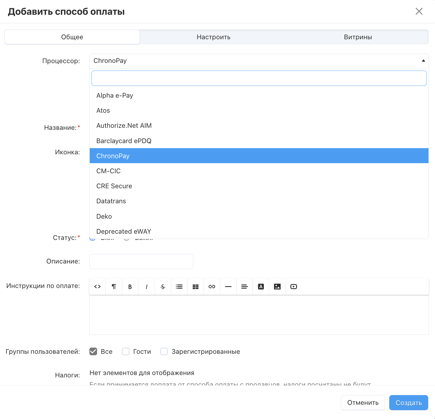 Выберите процессор оплаты “ChronoPay” в окне редактирования способа оплаты.
