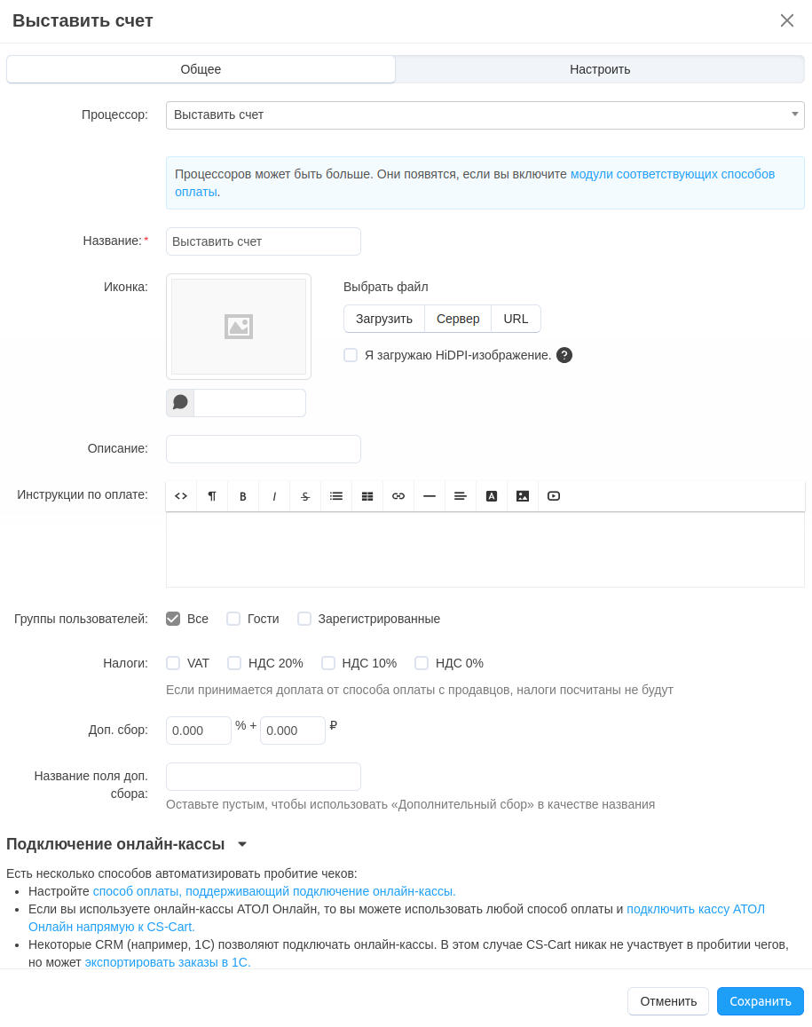 Выберите процессор оплаты “Выставить счёт” в окне редактирования способа оплаты.