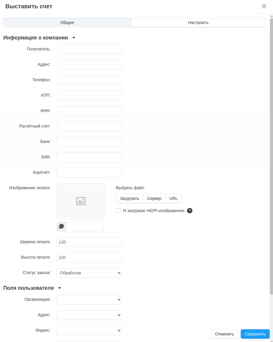 Получатель Данные получателя Адрес Адрес компании Телефон Телефон компании КПП КПП компании ИНН ИНН компании Расчетный счет Расчетный счет компании Банк Реквизиты банка компании БИК БИК банка Кор. счет Кор. счет компании Изображение печати Изображение печати, используемое на бланке выставления счета Ширина печати Ширина изображения печати Высота печати Высота изображения печати Статус заказа Статус присваиваемый заказу, при использовании данного способа оплаты Организация Поле содержащее данные покупателя Адрес Поле используемое в качестве адреса пользователя Индекс Поле используемое в качестве индекса пользователя Телефон Поле используемое в качестве телефона пользователя ИНН Поле используемое в качестве ИНН Банковские реквизиты Поле содержащее банковские реквизиты