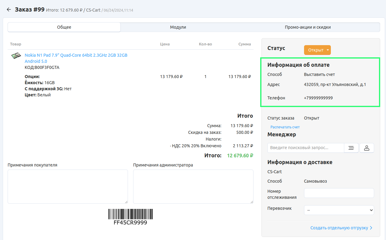 Вкладка “Информация об оплате” содержит информацию о покупателе и организации.