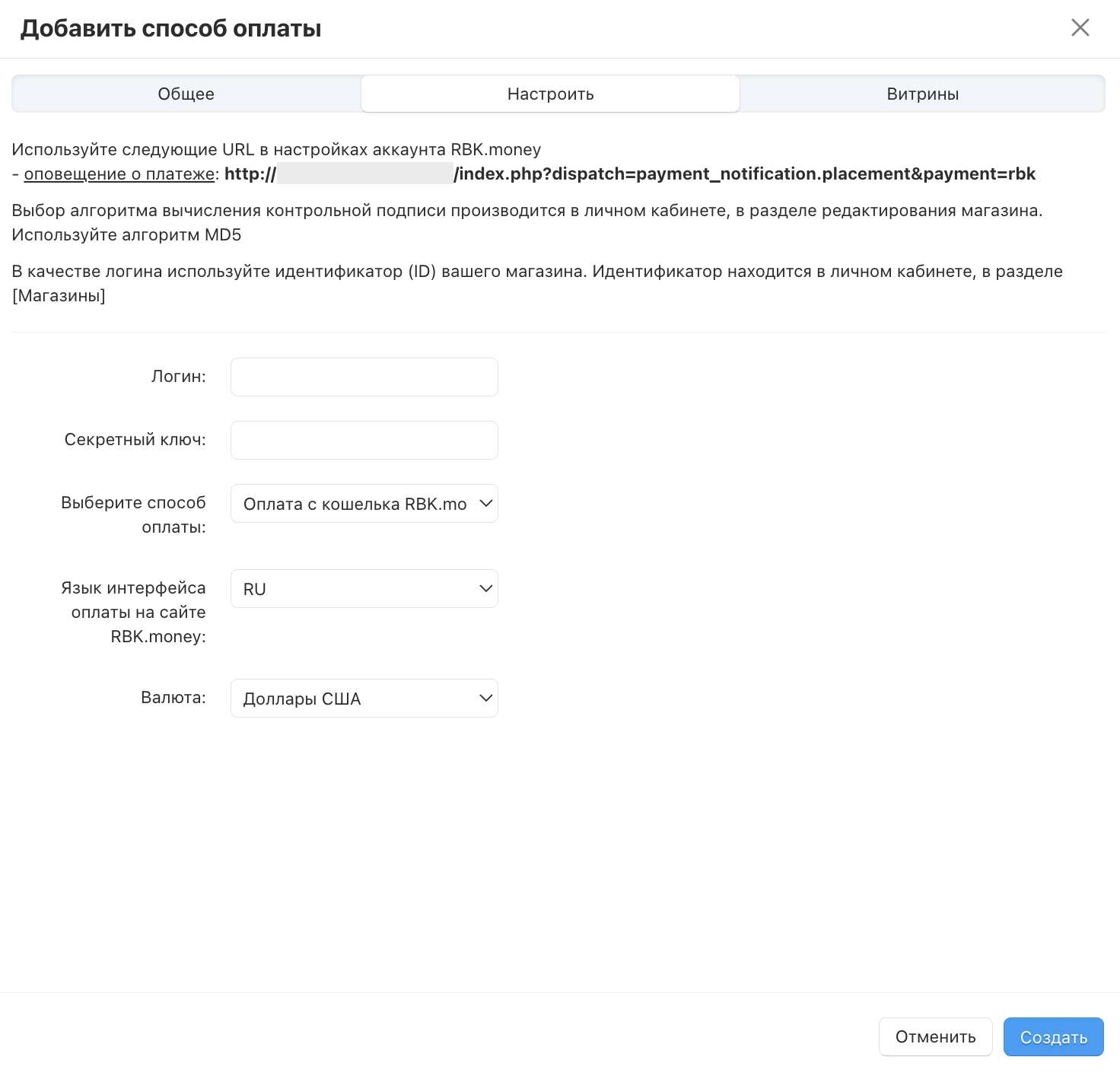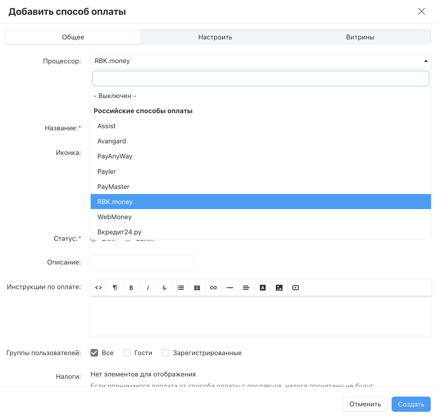 - Выберите процессор оплаты “RBK.Money” в окне редактирования способа оплаты.