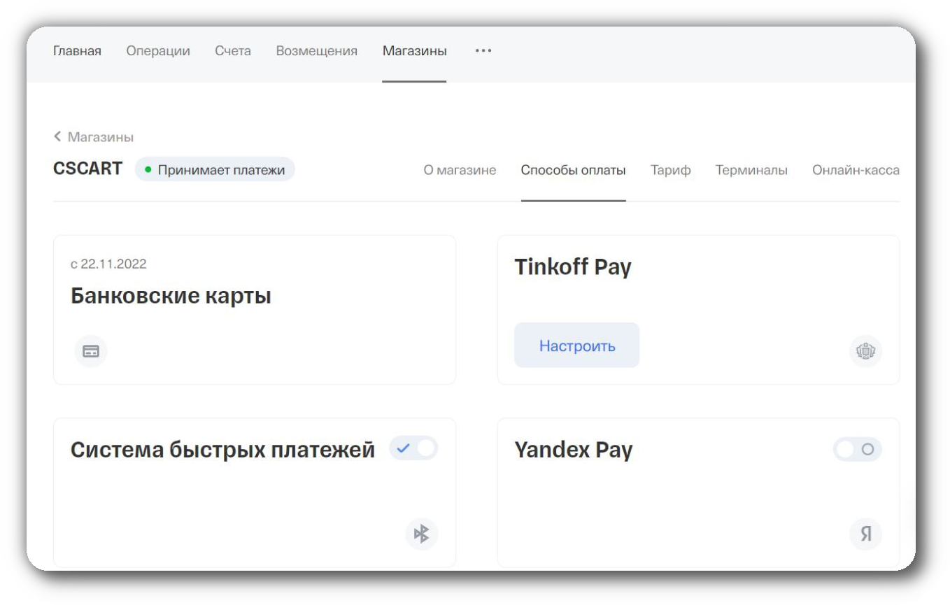 Так на вкладке Способы оплаты указаны доступные способы оплаты. На момент выхода CS-Cart 4.16.1 с интеграцией с Т-Банк действуют банковские карты, СБП и оплата по QR-кодам.