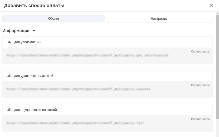 Из раздела Информация скопируйте самую первую ссылку “URL для уведомлений” — ссылка на страницу, которая принимает сообщения об успешной оплате, ошибках и другую нотификацию.