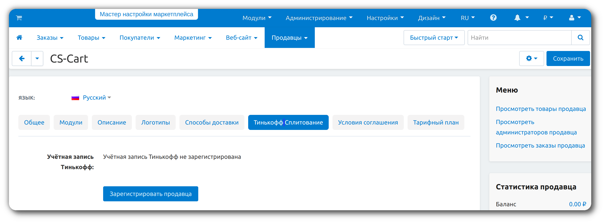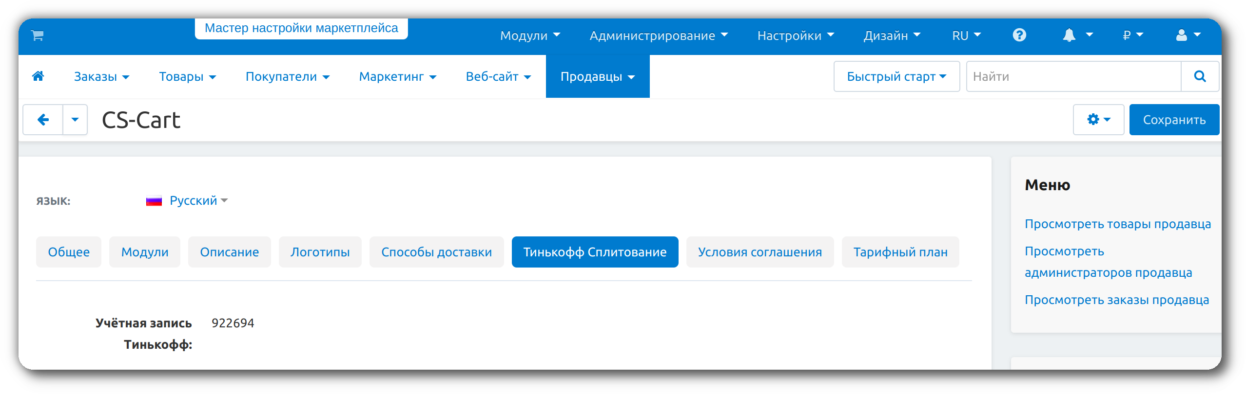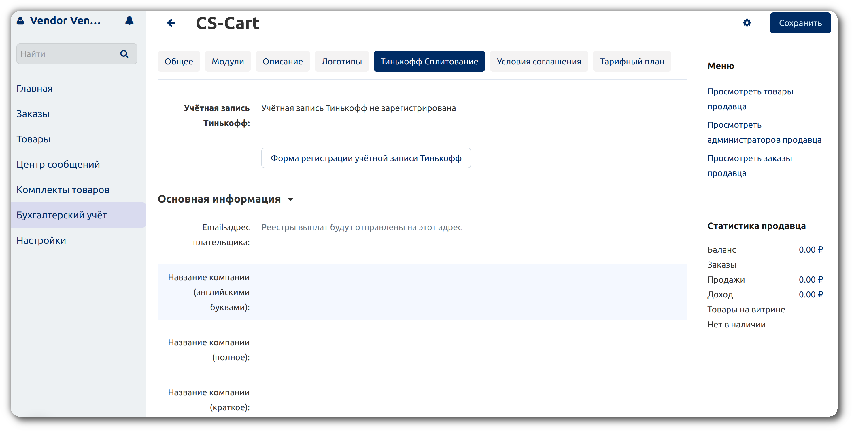 За регистрацию продавцов отвечает администратор маркетплейса, но все необходимые данные продавец заполняет самостоятельно на отдельной вкладке. Форма регистрации учётной записи Т-Банк находится на вкладке Т-Банк Сплитование на странице “Информация о продавце”.