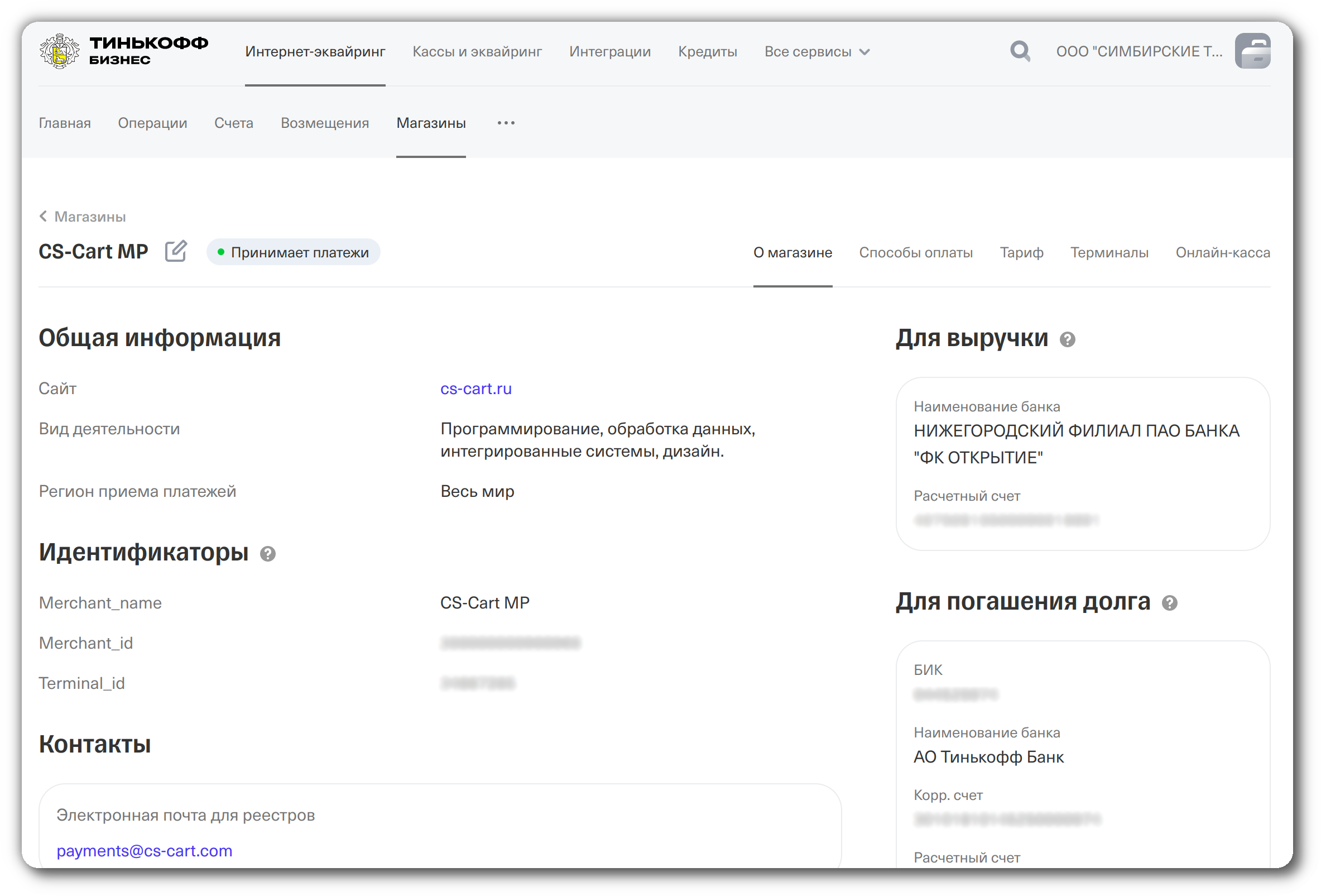 Далее перейдите в личный кабинет “Т-Бизнес” и откройте вкладку Интернет-эквайринг → Магазины. Кликните по названию вашего маркетплейса. Справа вы увидите несколько вкладок с настройками и полезными данными: О магазине, Способы оплаты, Тариф, Терминалы, Онлайн-касса.