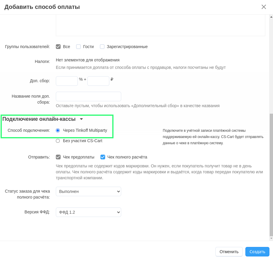 Обратите внимание, что в разделе Подключение онлайн-кассы нужно обязательно выбрать способ подключения Через Tinkoff Multiparty, иначе способ оплаты работать не будет.