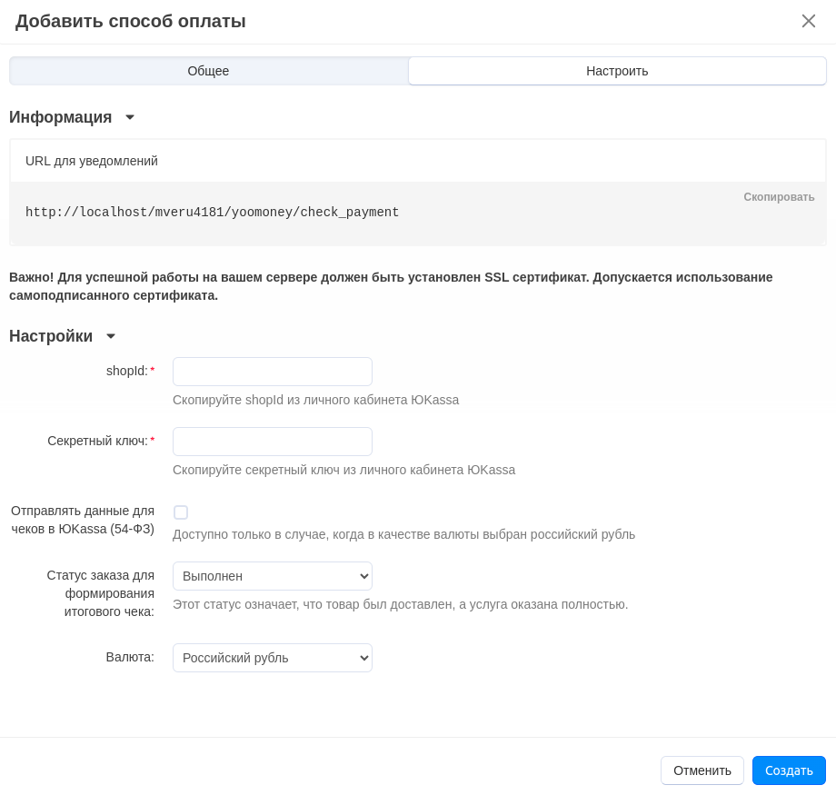 Для работы с ЮKassa на вашем сервере должен быть установлен SSL-сертификат. Можно использовать самоподписанный сертификат.