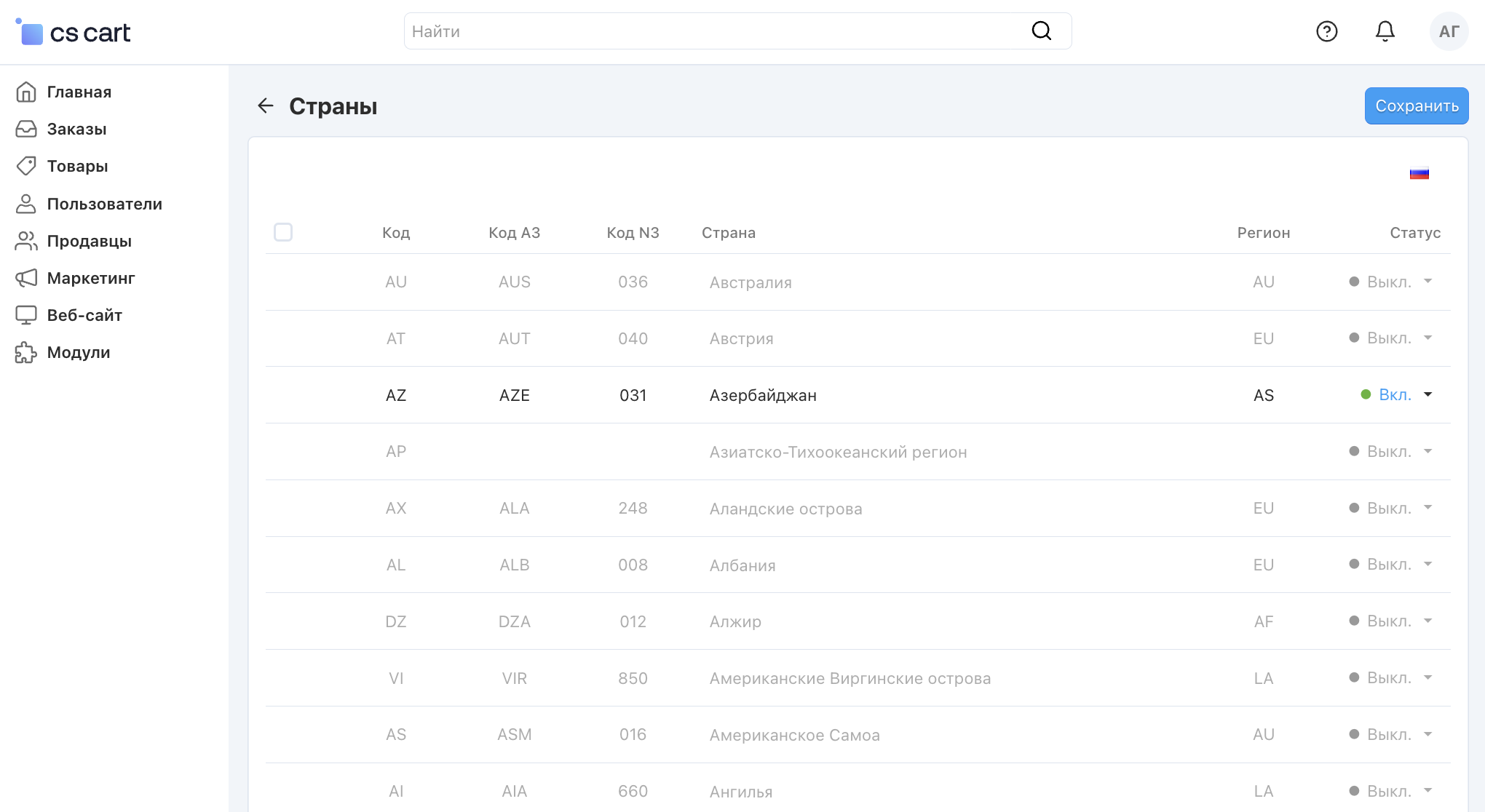 Если вы выключите страну, пользователи не смогут её выбрать в своём профиле и при оформлении заказа.