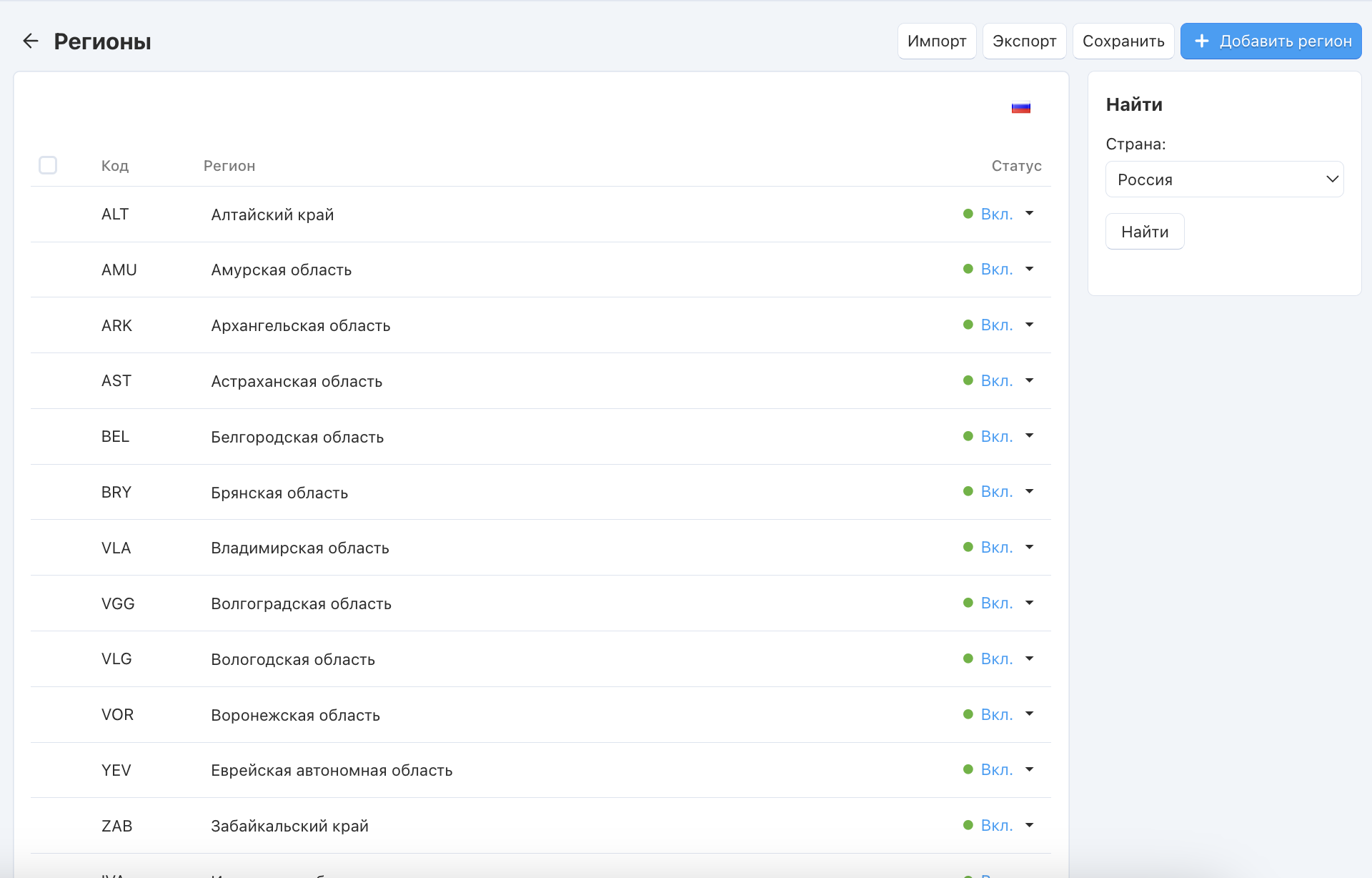 На странице Настройки → Способы доставки → Регионы можно редактировать список регионов, которые доступны в вашем магазине. Вы можете добавить, изменить или удалить регионы у каждой включенной страны.