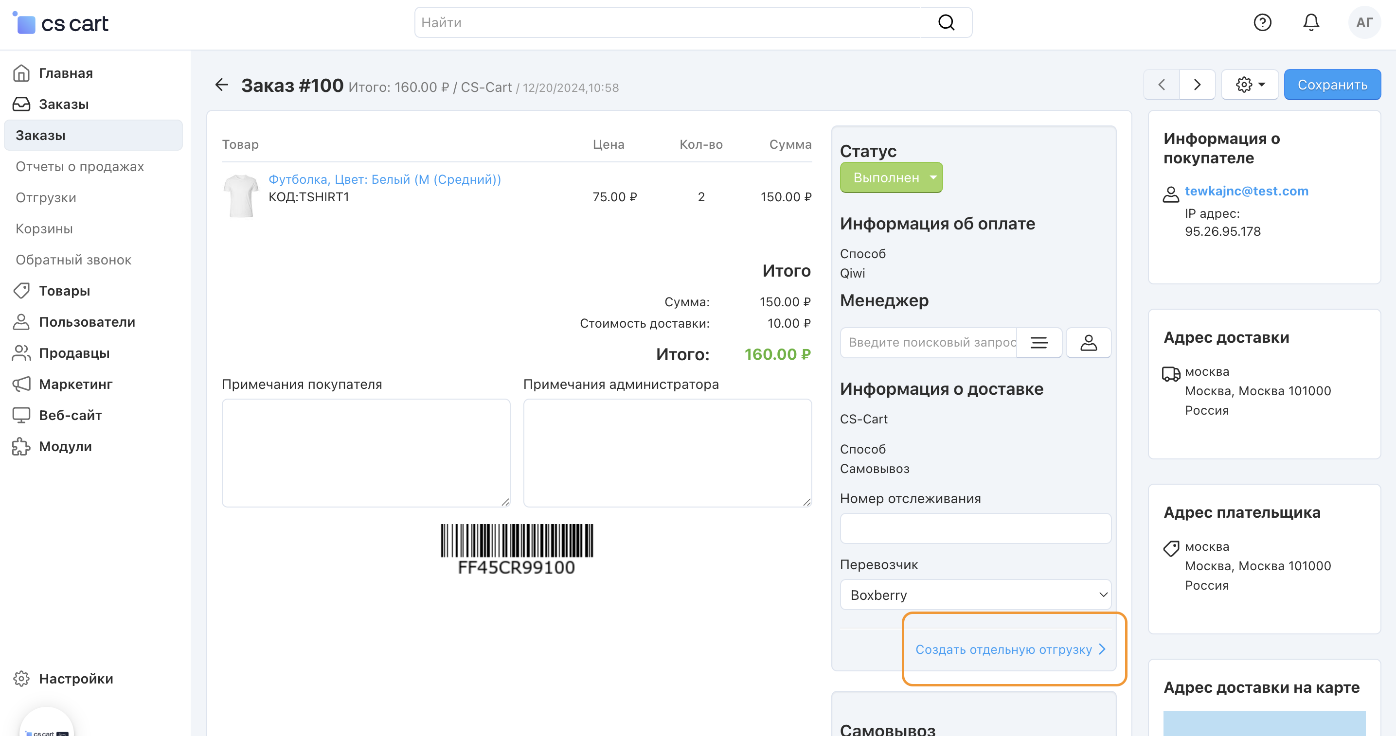 Откроется страница с информацией о заказе. Нажмите Создать отдельную отгрузку.