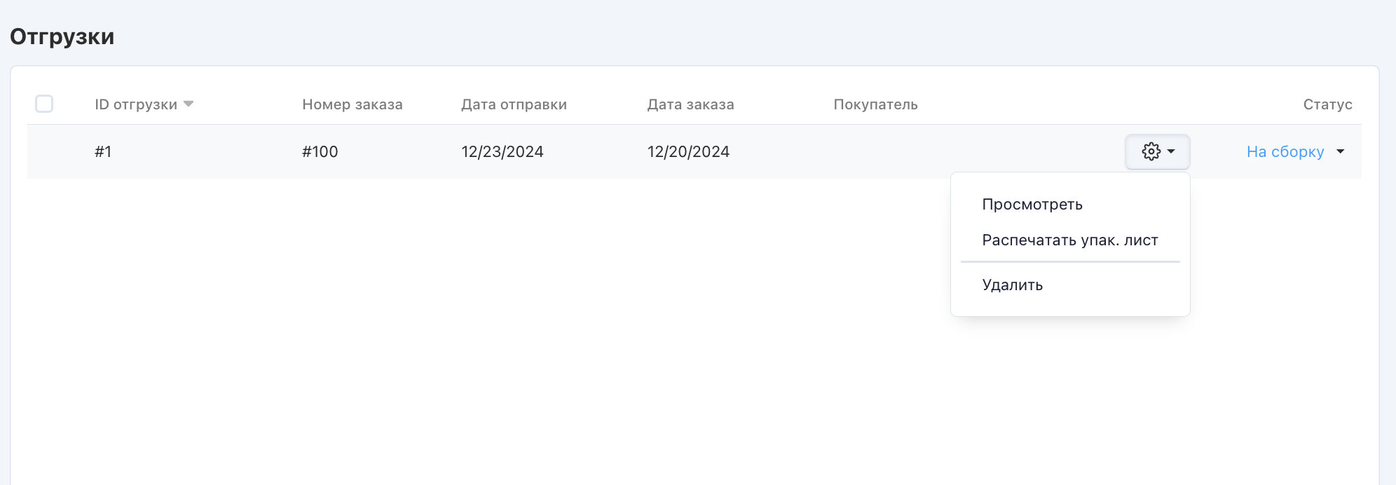 Для отгрузки можно распечатать упаковочный лист. Для этого перейдите на список отгрузок по ссылке Отгрузки либо через меню Заказы → Отгрузки → Способы доставки. После этого нажмите на кнопку с изображением шестерёнки рядом с отгрузкой и выберите вариант Распечатать упак. лист.