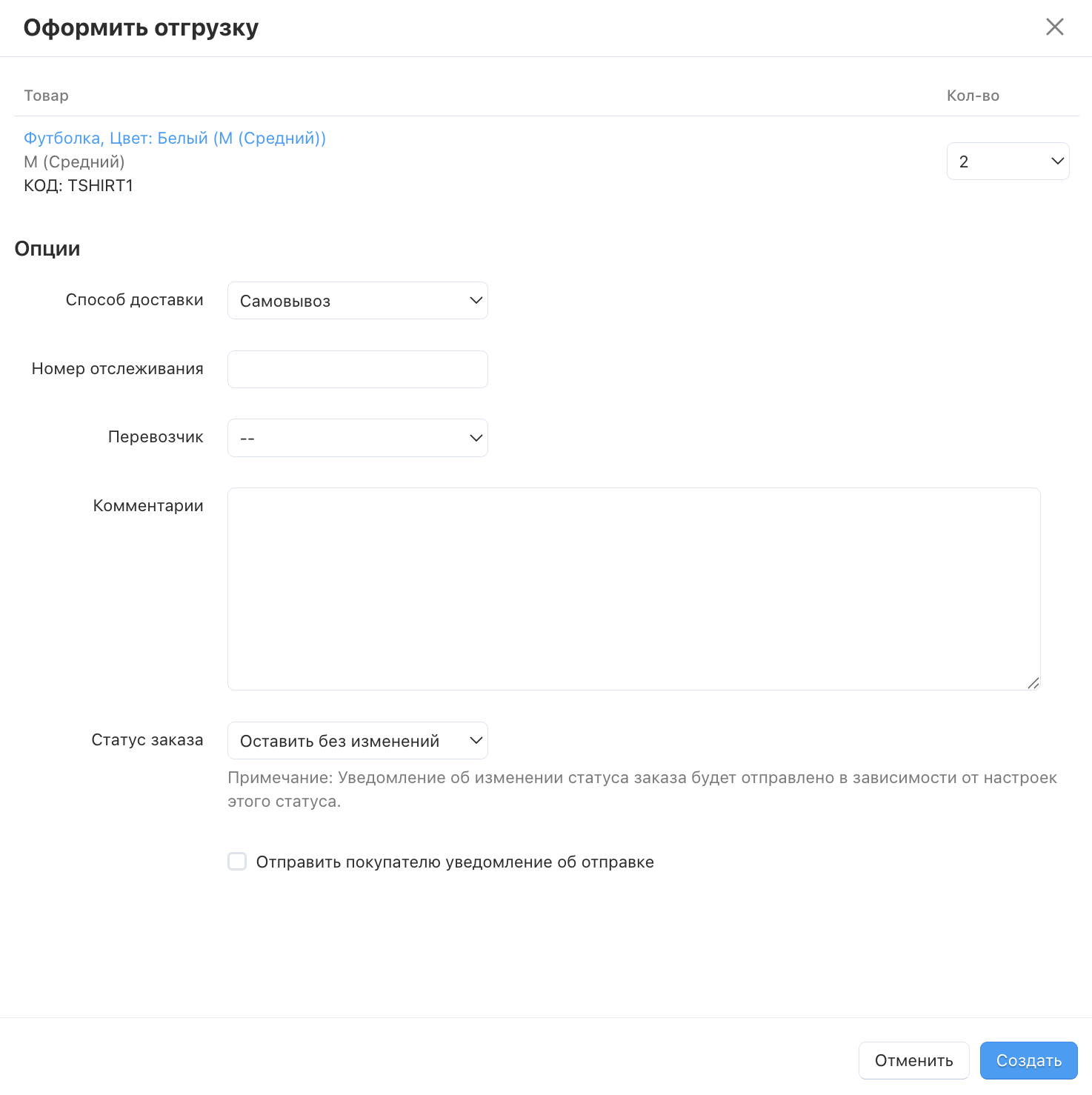 Отгрузка будет создана, а на странице заказа появится номер отслеживания.