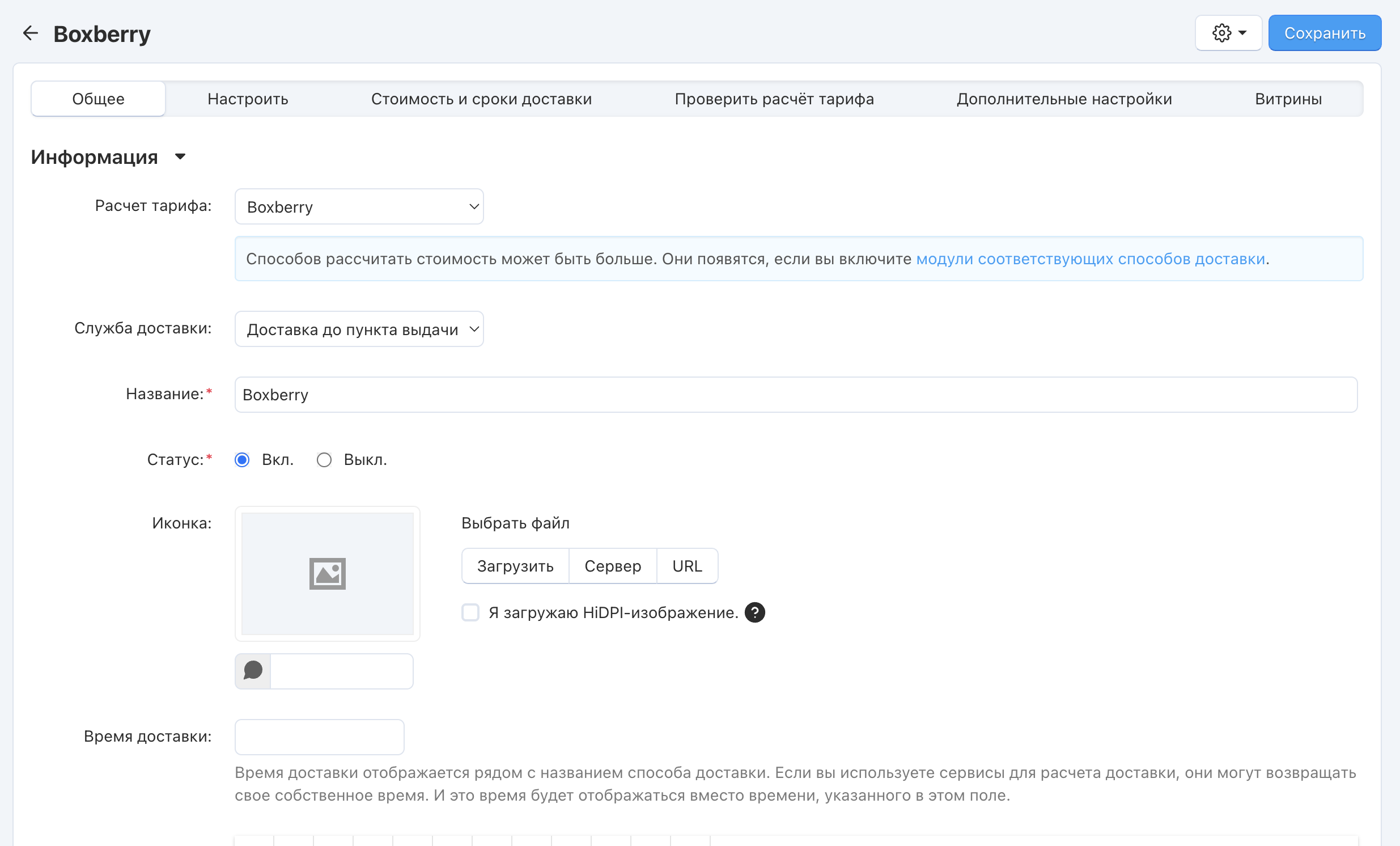 - Название — введите название способа доставки, которое покупатель увидит при оформлении заказа; например, Доставка до пункта выдачи Boxberry.