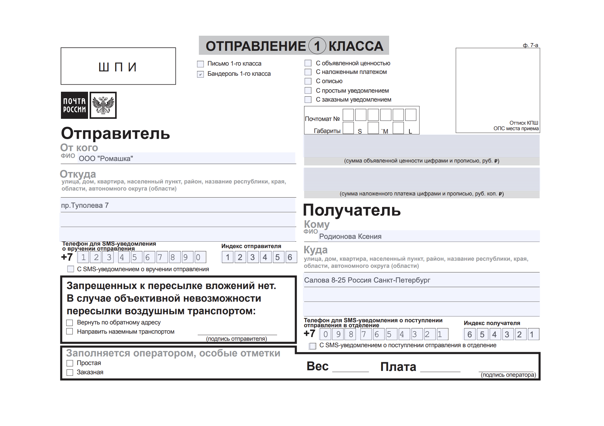 - Форма 7-а. Бланк адресного ярлыка для отправлений 1 класса.