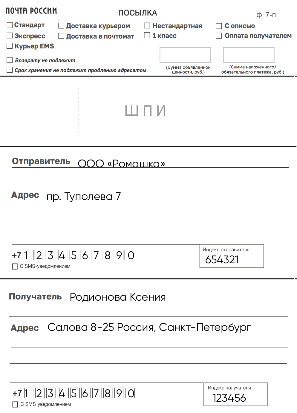 - Форма 7-п. Сопроводительный адрес к посылке.