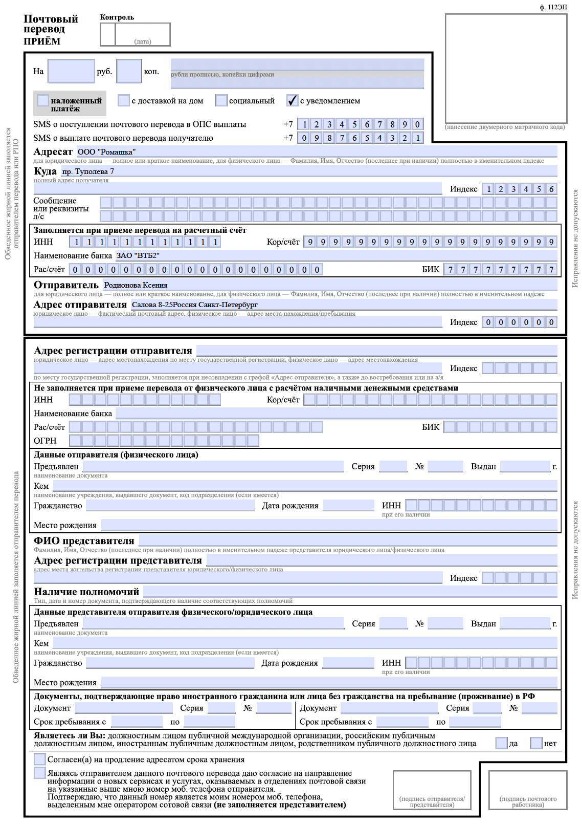 - Форма 112эп. Бланк почтового перевода.