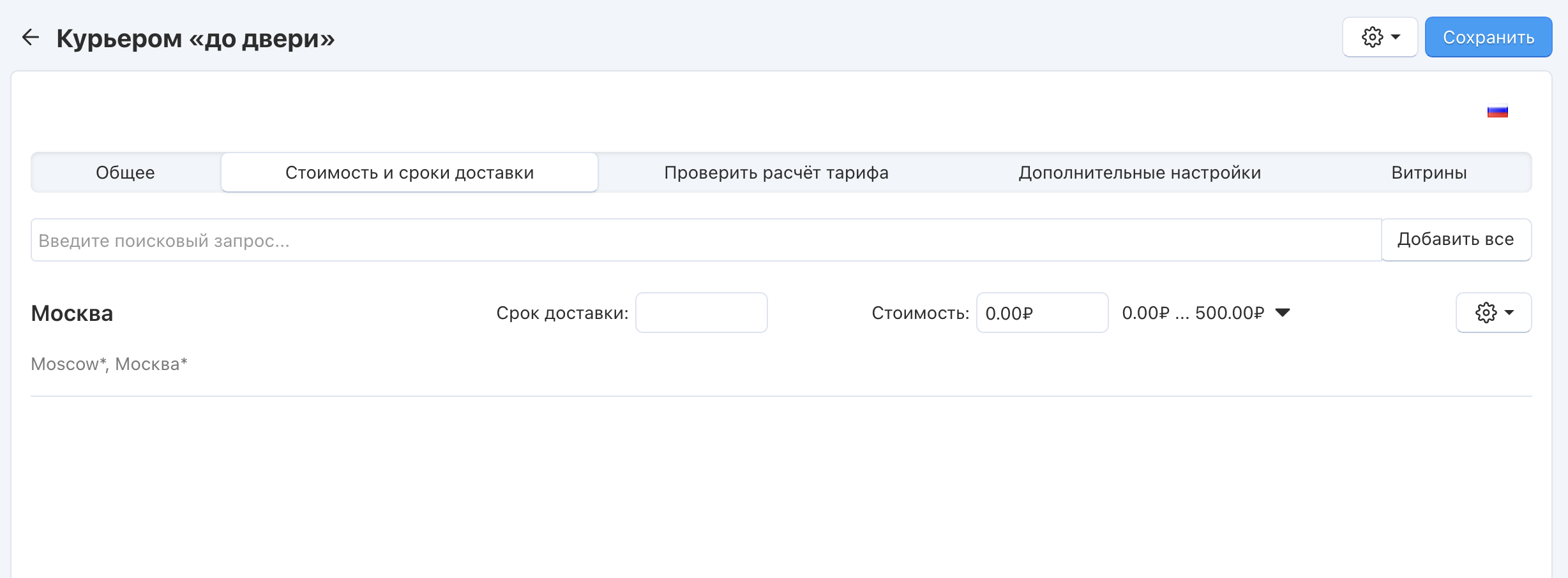 3. В настройках способа доставки перейдите на вкладку Стоимость и сроки доставки.