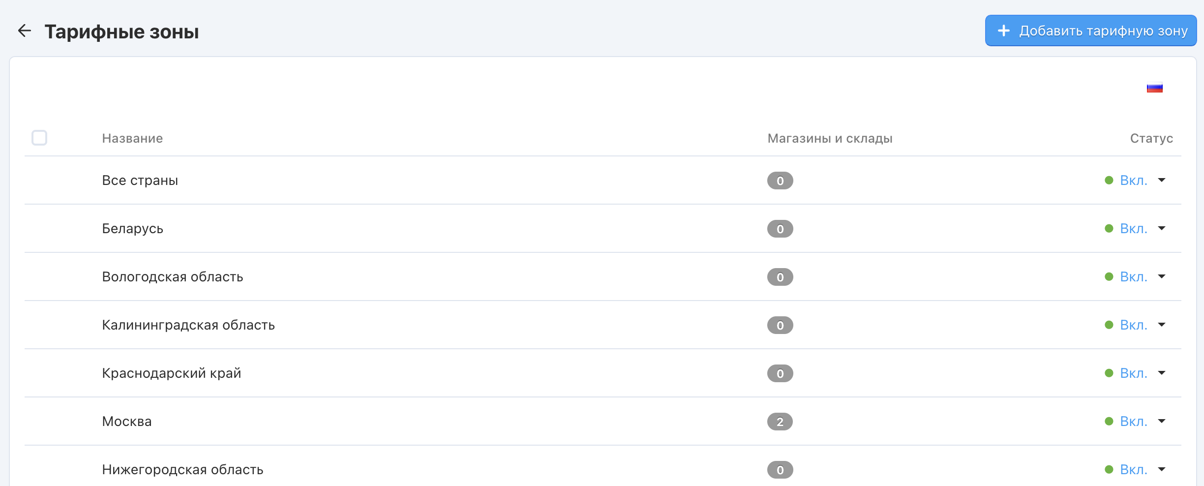 1. Откройте страницу Настройки → Способы доставки → Тарифные зоны.
